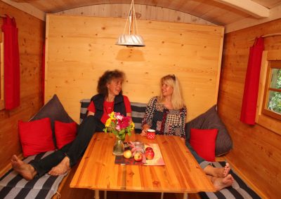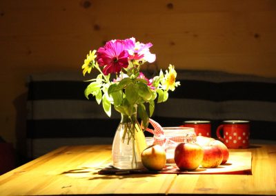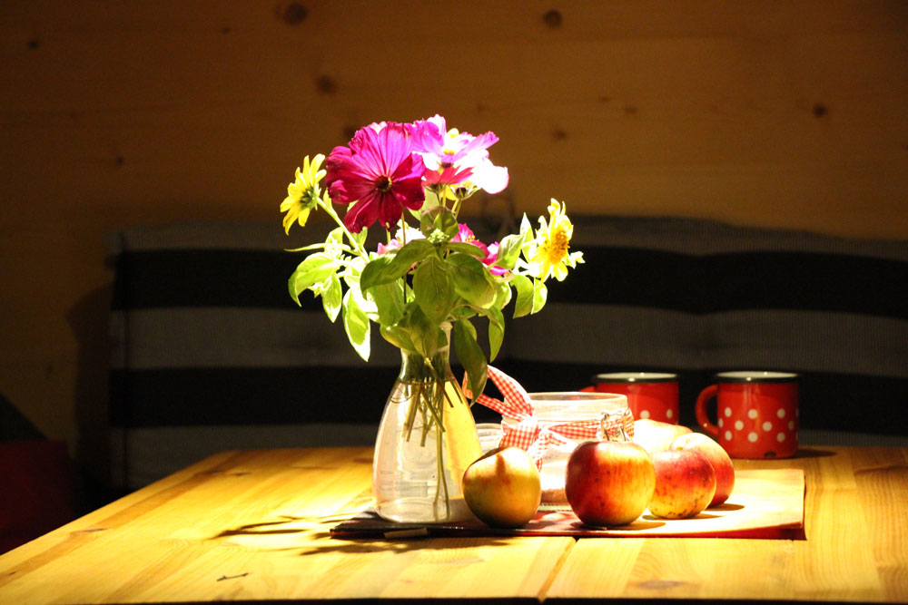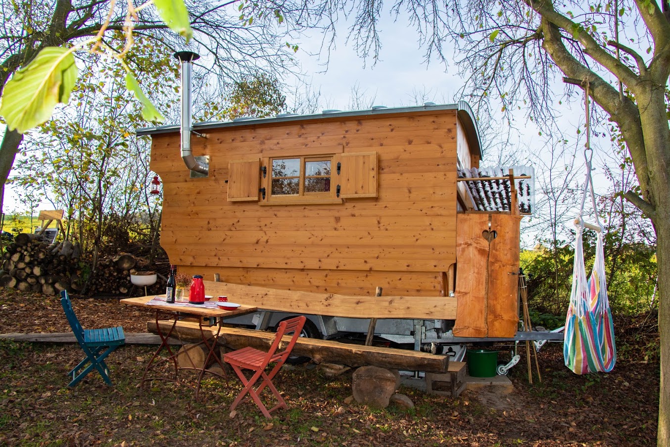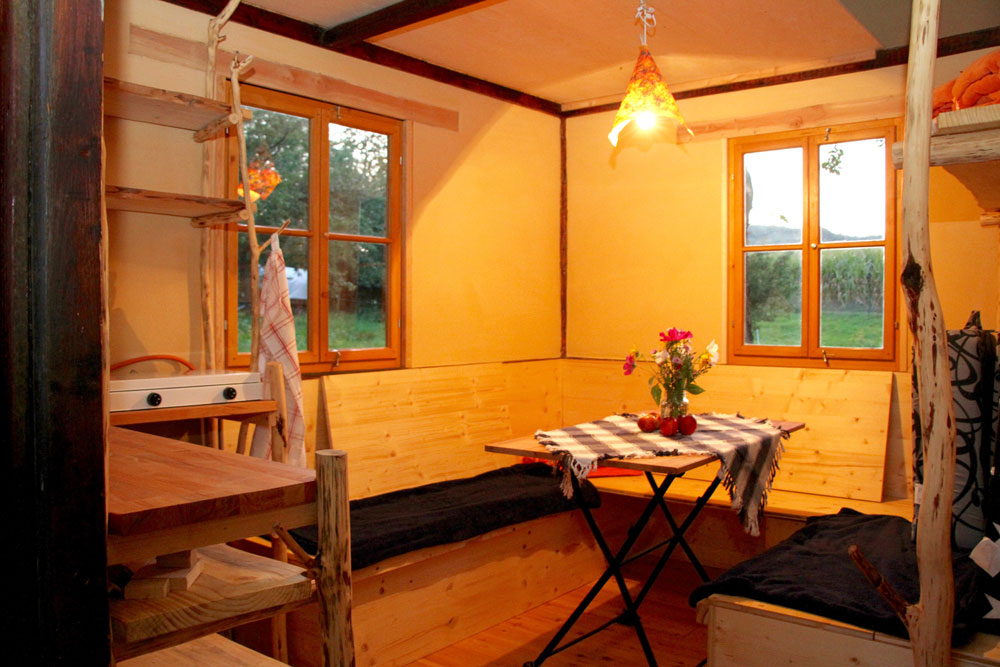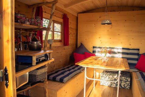 Es stehen dir Solarstrom und Trinkwasser zur Verfügung. Der Hotbot kann mit Bachwasser befüllt werden. An kühlen Abenden kannst du den kleinen Kaminofen im Schäferwagen oder eine Lagerfeuerstelle nutzen.