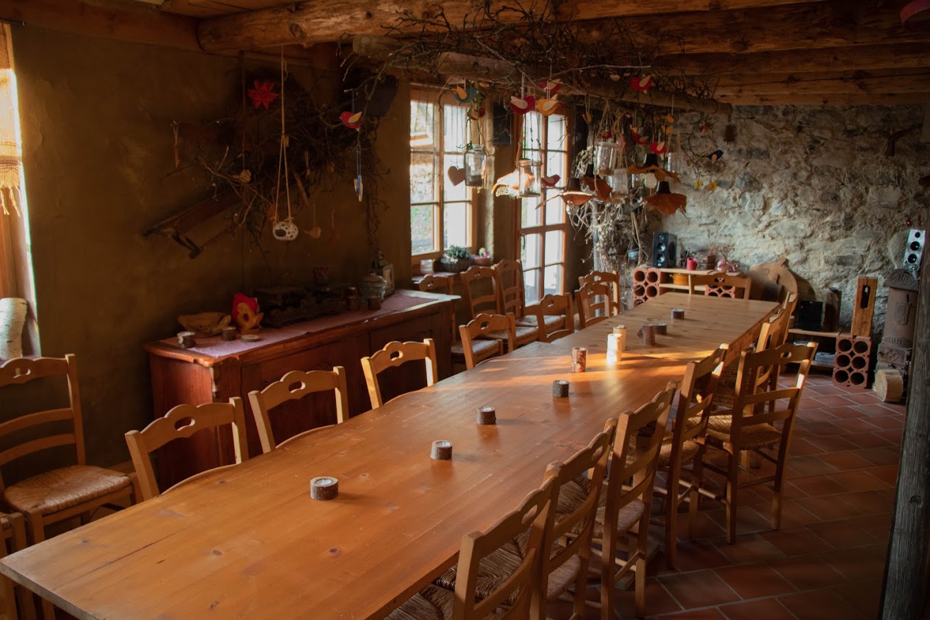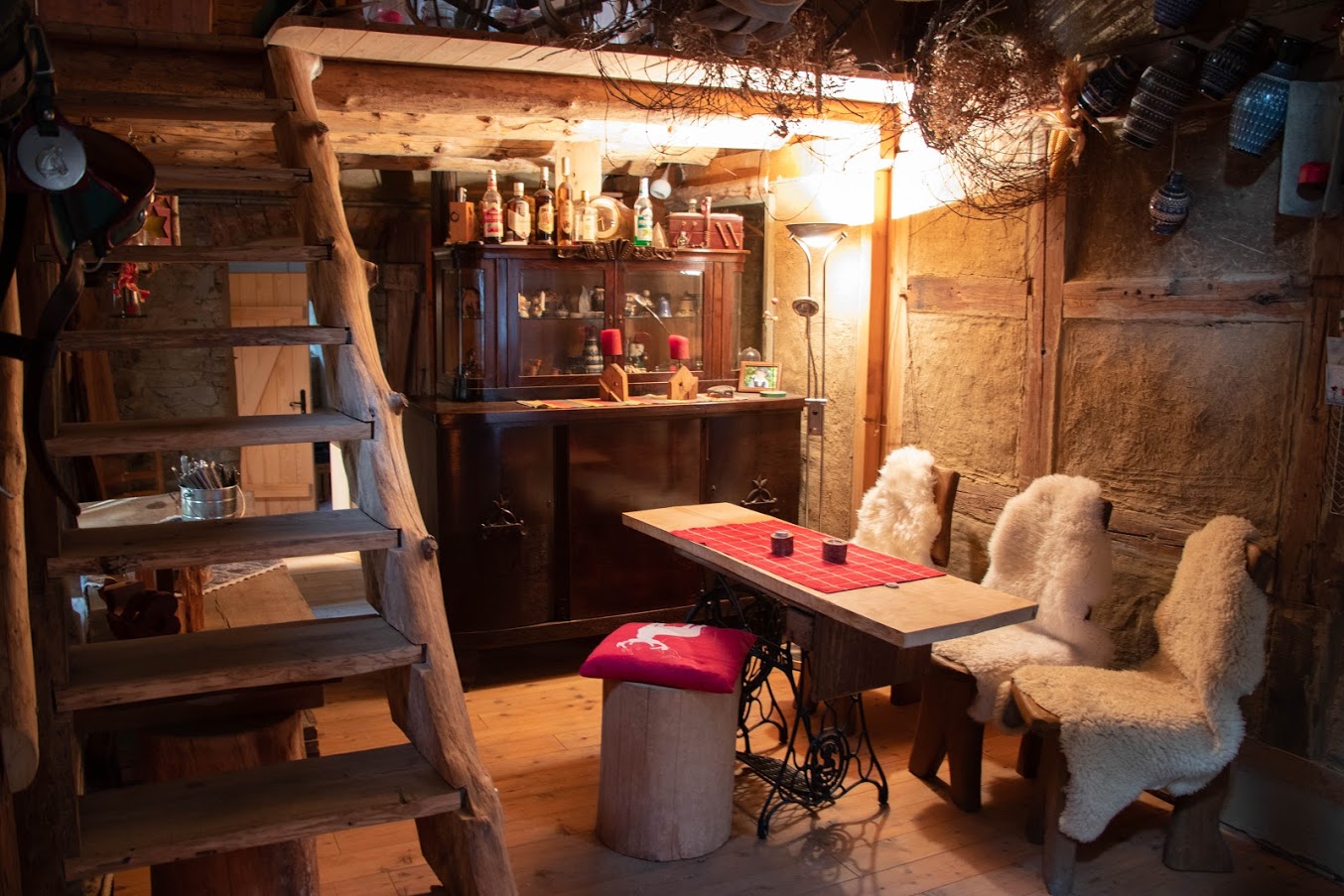 Ein rustikaler Raum für max. 20 Personen steht dir für deine nächste Feier zur Verfügung. Brauchst du einen Platz zum Verweilen, biete ich dir eine etwas andere Übernachtung in gemütlicher Umgebung. In der umgebauten Scheune finden zwei Personen in einem Doppelzimmer sowie vier Personen in einem mit Matrazen ausgelegten Zimmer Platz. Außerdem kannst du auf drei Etagen eine Galerie, eine Küche mit Essecke, ein Badezimmer, einen großen Raum mit Kamin sowie einen Hotpot im Garten nutzen.