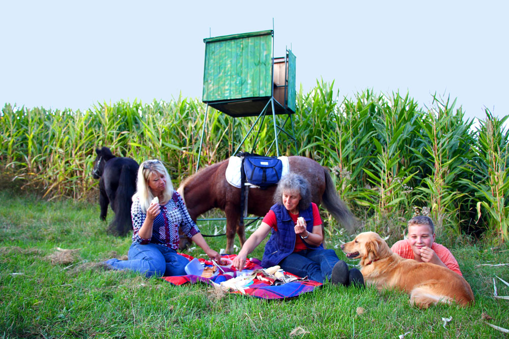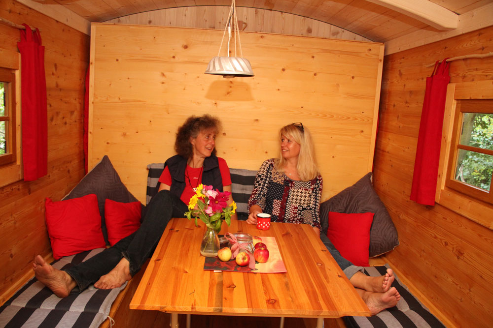 Abseits des Dorfes inmitten der Natur direkt neben der Pferdekoppel erwartet dich ein gemütlich eingerichteter Schäferwagen für maximal 3 Personen. Zwei weitere Personen können im Planwagen nebenan übernachten. Von hier habt ihr einen wunderschönen Blick auf die Pferde.